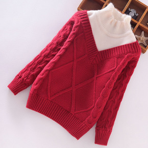 儿童高领毛衣v领韩版麻花拼接女童打底毛衣内搭半高领...