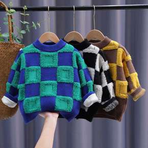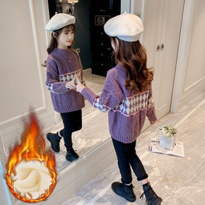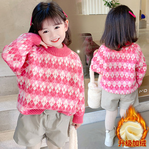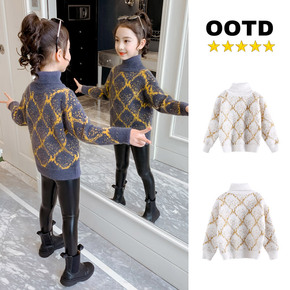 高领毛衣女童韩版2022年冬季菱形格子针织套头衫加...