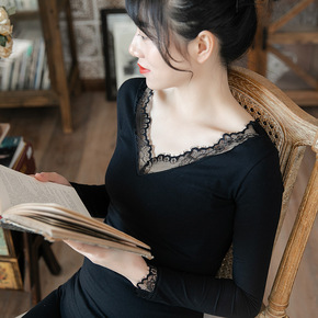 秋衣秋裤女士薄款纯棉低领打底大码棉毛衫蕾丝全棉保暖...