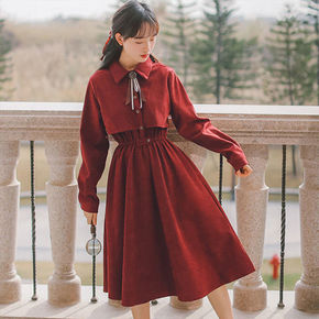 红色连衣裙女小个子学生过年衣服装厚款加绒法式赫本风...