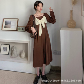 孕妇裙子秋冬装日韩方领蝴蝶结气质连衣裙女ins潮长...