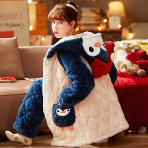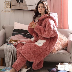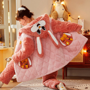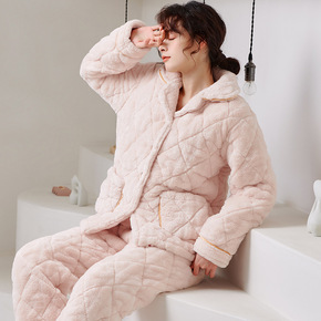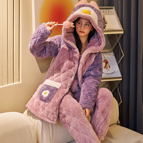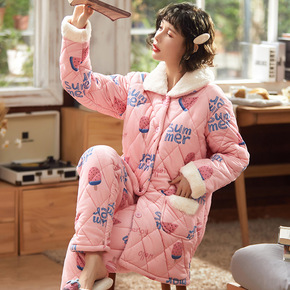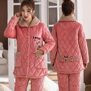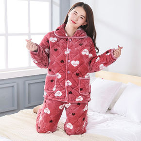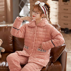 睡衣女士冬天三层加厚夹棉袄珊瑚绒法兰绒加绒保暖秋冬...