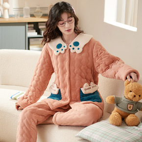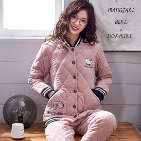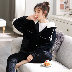 冬季睡衣女珊瑚绒三层夹棉加厚保暖加绒棉袄大码可外穿...