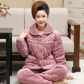 睡衣女秋冬季中老年妈妈款珊瑚绒三层夹棉加厚保暖加绒...