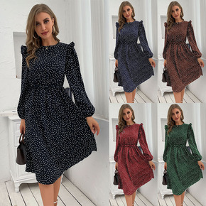 独立站跨境平台新款欧美时尚外贸女装荷叶边波点长袖连...