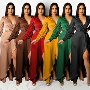 OS6368跨境新品欧美女装时尚性感V领绸面纯色绑...