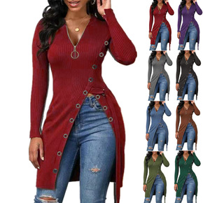 2022秋冬速卖通独立站欧美外贸女装V领长袖开叉螺...