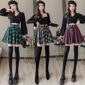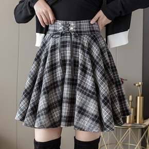 实拍2021年秋季高腰显瘦新款格子毛呢A字半身裙子...