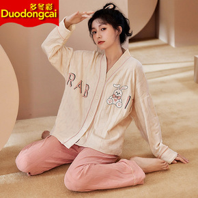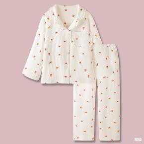 睡衣女春秋季针织棉提花长袖长裤开衫可爱日系薄款家居...