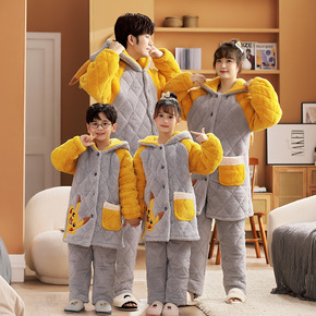 儿童睡衣冬季法兰绒女童亲子一家三口装三层夹棉珊瑚绒...