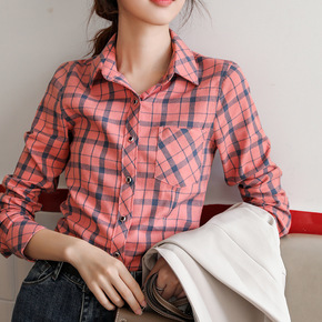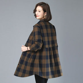 格子衬衫女春秋新款中长款上衣洋气大码妈妈长袖外穿衬...