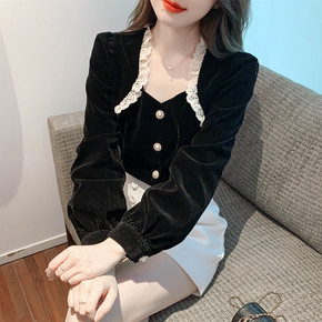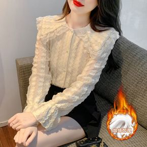 2022秋冬新款加绒加厚娃娃领喇叭袖蕾丝衫法式长袖...