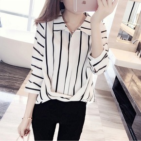 秋冬装新款镂空显瘦减龄蕾丝条纹拼色女衬衫 长袖修身...