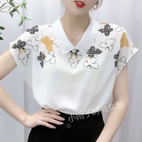 娃娃领印花衬衣女夏装新款宽松时尚百搭显瘦短袖雪纺上...