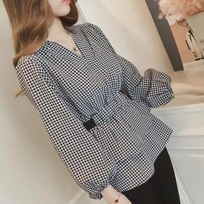 2021春装新款很仙的大码格子衬衫女韩版收腰上衣灯...