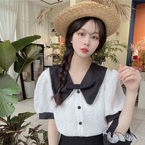 方领泡泡袖短款衬衫女2022年夏季法式小众甜辣蝴蝶...