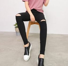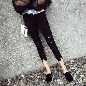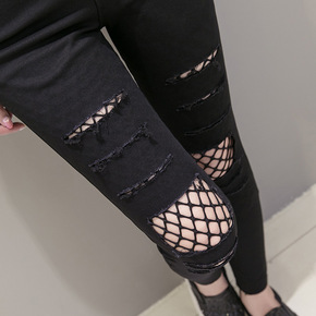 破洞仿牛仔裤女高腰打底裤外穿薄款大码小脚裤黑色铅笔...