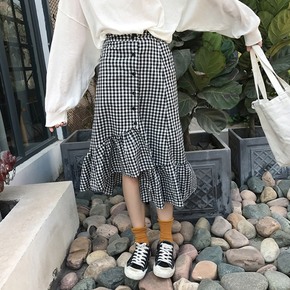 复古格纹针织半身裙女秋冬高腰A字伞裙中长款包臂百褶...