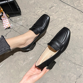单鞋女2021春秋新款一脚蹬中粗跟复古甜美浅口小皮...