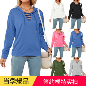 欧美跨境女装纯色连帽卫衣女2022亚马逊秋冬新款领...