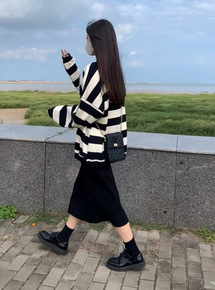 一件代发棉质薄款条纹圆领卫衣女秋季宽松长袖中长款上...