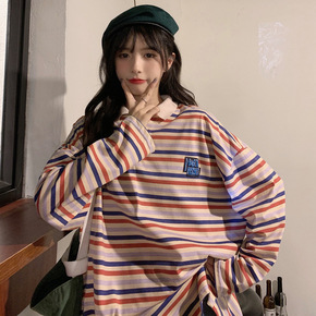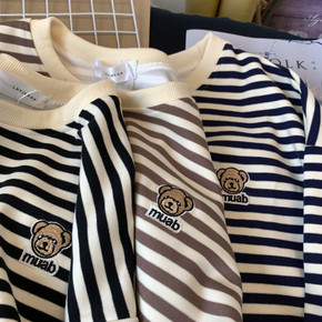 刺绣小熊2022年新款春秋薄款宽松条纹卫衣女bf慵...