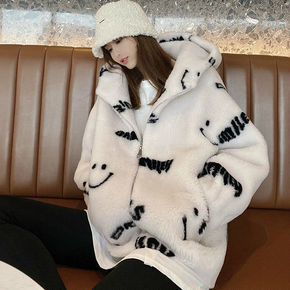 加绒加厚新款一体颗粒羊剪绒宽松显瘦大衣笑脸连帽外套...