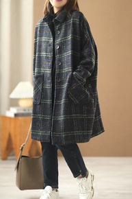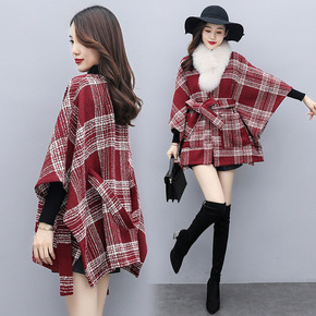 木瓜牛奶秋冬季新品韩版气质蝙蝠袖斗篷外套格纹大码呢...