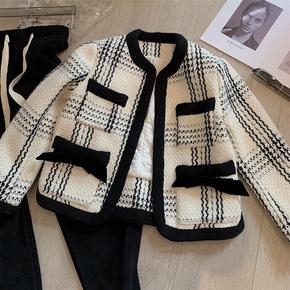 气质格纹加厚蝴蝶结小香风外套女2021冬季新款夹棉...