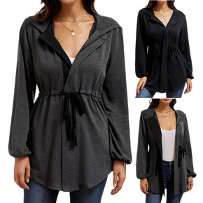 2021欧美亚马逊新款女装纯色休闲拉链束腰灯笼袖宽...