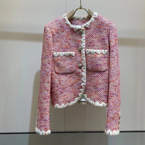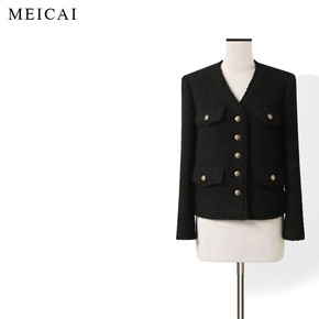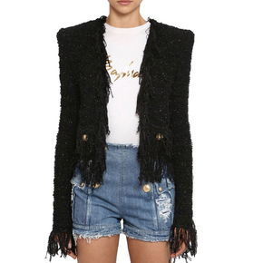 2021春秋新款黑色亮丝粗花呢流苏边口袋纽扣装饰开...