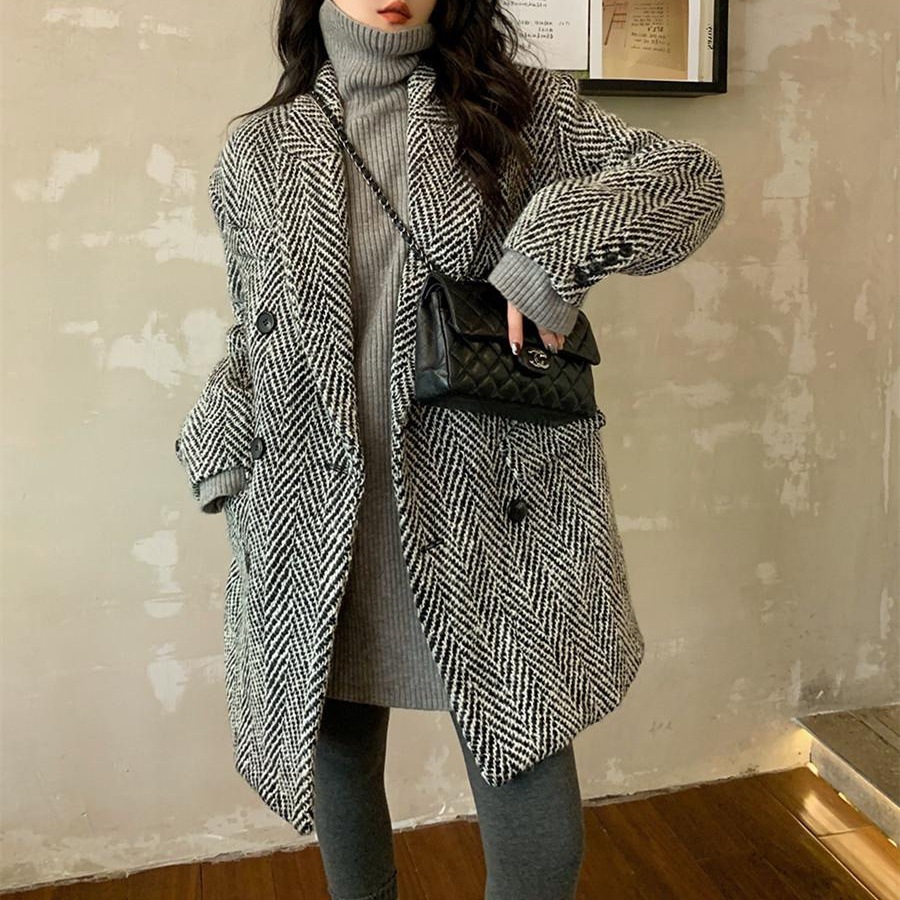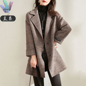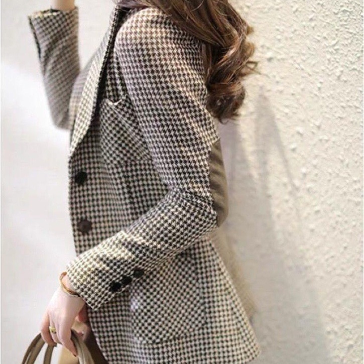 【广州原版】千鸟格毛呢小西装外套女中长款修身气质西...