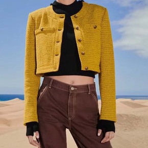 欧美风2021秋季女装新款高腰姜黄色纹理修身小香风...