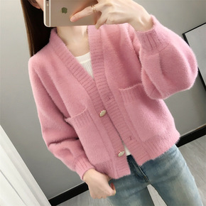 仿水貂绒针织开衫女新款韩版加厚短款小个子宽松外穿毛...