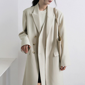 2021年新款欧美时尚经典简约双排扣过膝加长款修身...
