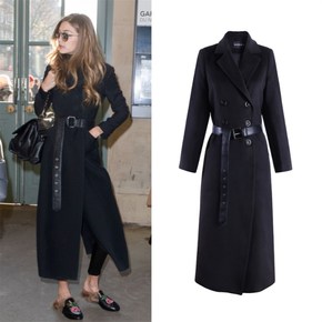 2020秋冬欧美毛呢外套明星同款黑色修身西装领长款...
