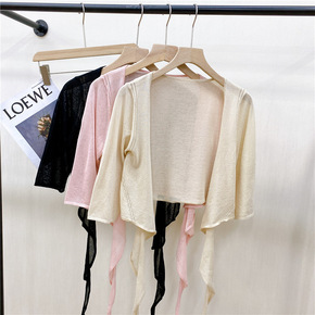 冰丝针织开衫披肩系带2022新款夏季短款空调防晒衫...