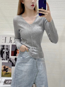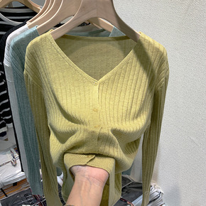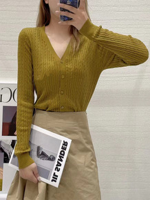 宇诚复古螺纹羊毛针织开衫女春秋v领长袖修身显瘦薄款...