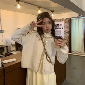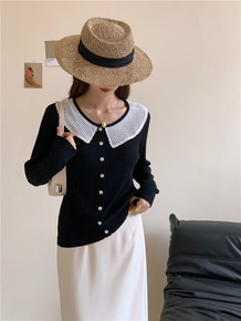 6611浪漫法式复古气质优雅蕾丝娃娃领羊绒慵懒针织...