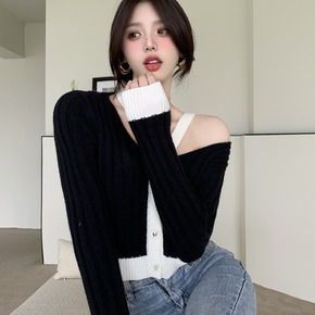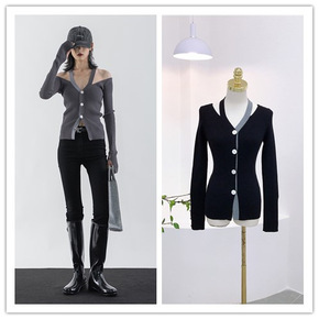 6433#秋冬季新款港味复古V领露肩撞色修身显瘦性...