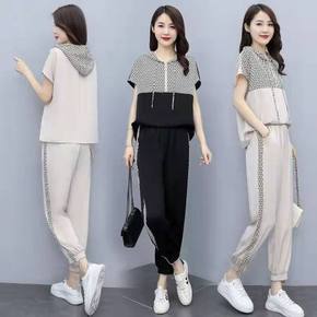 潮流套装洋气减龄连帽撞色短袖卫衣遮肉显瘦休闲运动哈...