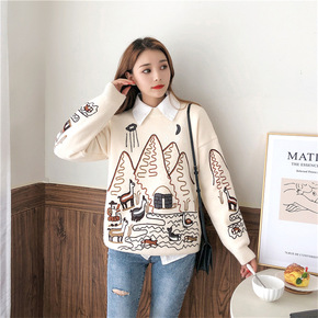 毛衣女新款2021秋冬黑白色廓形绘画涂鸦宽松慵懒开...