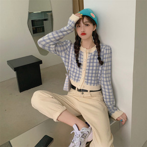 新款格子毛衣外套女日系2022初春新款长袖针织开衫...