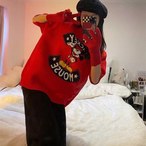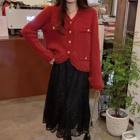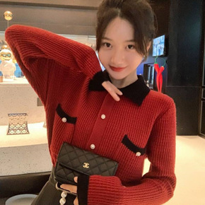 日系可爱红色毛衣外套开衫女春秋外套款长袖甜美毛衣针...