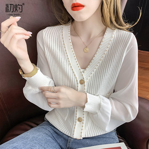 针织开衫毛衣女春装2022年新款宽松气质V领网纱拼...