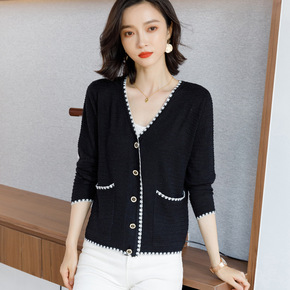 小香风外套针织开衫女早秋新款2021薄款撞色长袖宽...