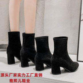 2021秋冬新款短靴短筒马丁靴女尖头单靴百搭高跟裸...