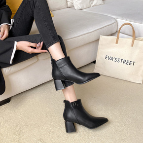 小短靴女粗跟春秋单靴2022年冬季新款简约百搭尖头...