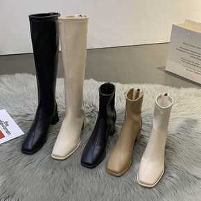 2022年冬季杏色女靴子细跟高跟短靴欧美尖头皮鞋马...
