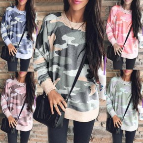 2021亚马逊秋冬热卖欧美新款上衣 迷彩印花圆领长...
